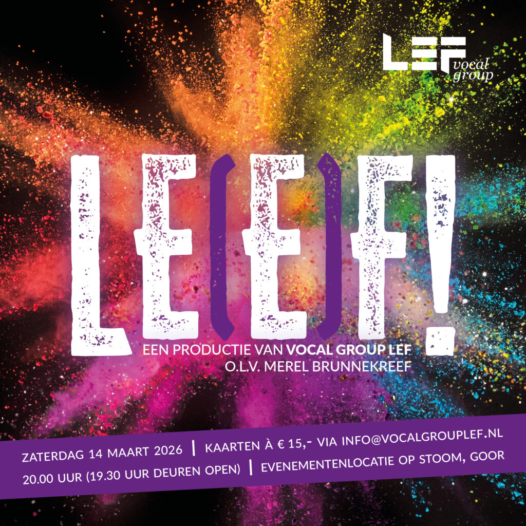 Bijzijn is meemaken, dus koop je kaarten snel via info@vocalgrouplef.nl.